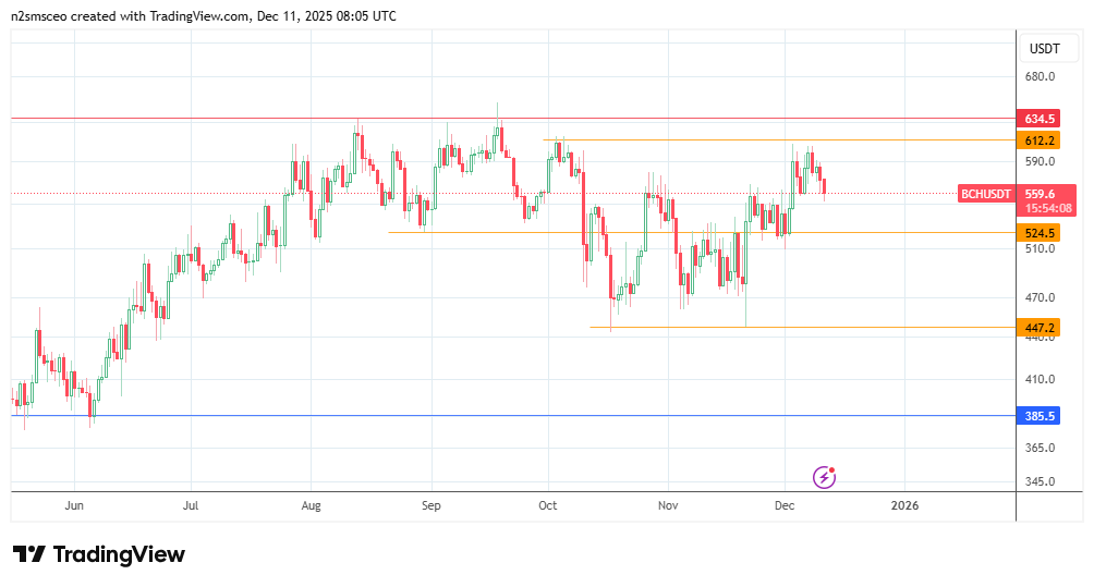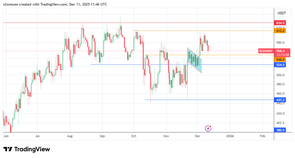 Figure 2: Daily chart of BCH/USDT showing key near-term levels (snapshot taken on December 11, 2025)