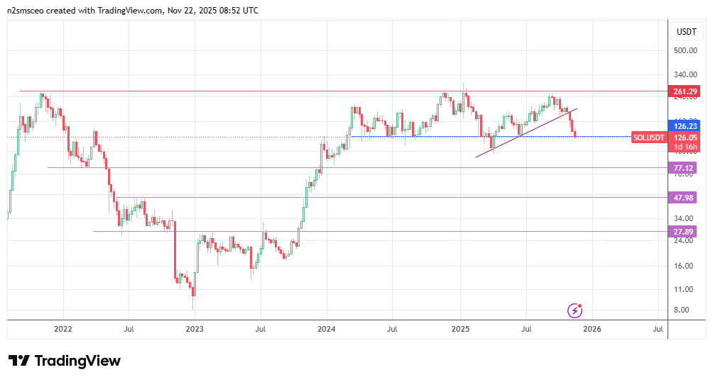 Solana price today stands at $125.90, following a third week of a decline that started from October 2025. This follows the selloff in Bitcoin prices, which have gone from $126,000 to below $85,000 in three weeks of selling.