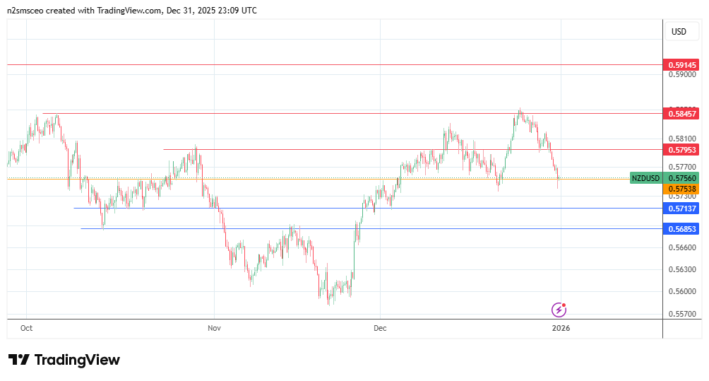 The price is currently testing the 0.5756 support, the prior low of 26 September 2025. This follows the decline from the 0.5845 resistance that took out the 0.5795 support. A breakdown of the current support brings 0.5713 into the picture, being the former low of 2 December. The 14 October low at 0.5685 forms an additional layer of support.