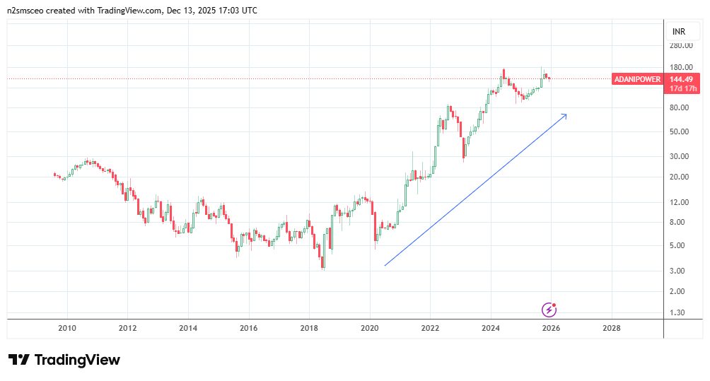 Figure 1: Monthly chart of ADANIPOWER showing long-term uptrend (snapshot taken on December 13, 2025)