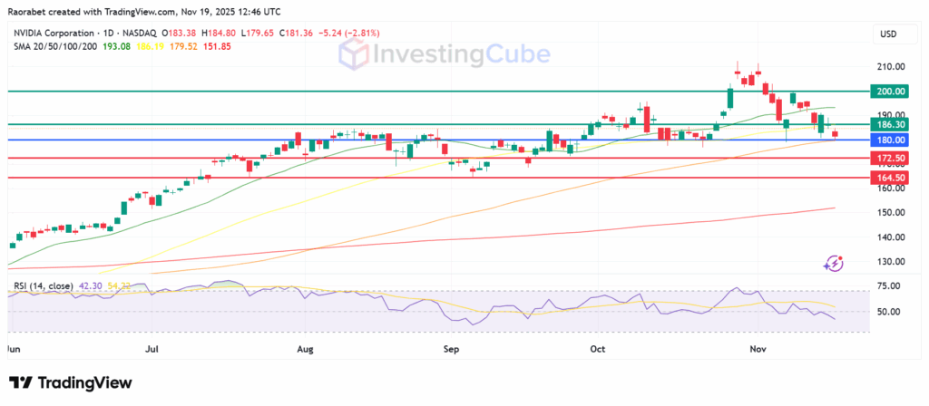 Nvidia stock price hovers above the 100 and 200-day SMA at $179.52 and $151.85 respectively, but below the 20-day SMA of $193.08, signaling short-term caution yet long-term bullish bias. RSI at 42 indicates weak buying momentum, leaving room for a post-earnings pop if positives emerge.