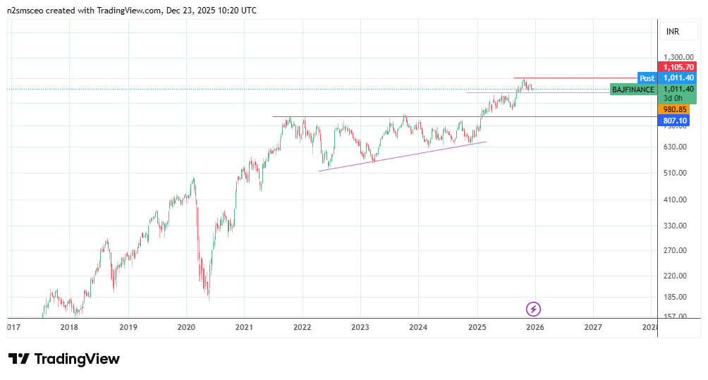 The Bajaj Finance share price today is off its all-time highs due to profit-taking which hit the Indian bourses in December. The INR 1,102.5 price mark set on October 23, 2025 is the highest the share price of Bajaj Finance has ever attained.