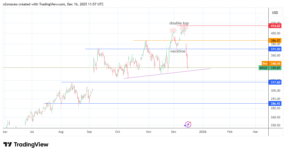 The Broadcom stock price today is up slightly in premarket trading, following three days of heavy selling. The selloff followed the double top at the all-time high and the break of the 371.50 neckline. The price is now slightly above the support trendline, where the measured move from the pattern’s breakdown is expected to conclude.