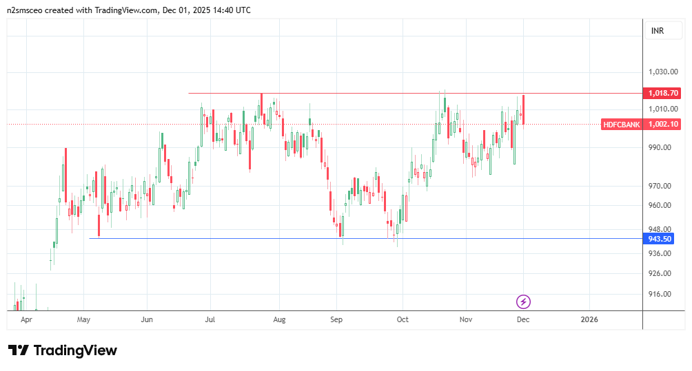 The HDFC Bank share price NSE fell 0.55% on December 1, 2025. A look at the HDFC Bank share price history indicates that the recent decline came off the retest of the resistance formed by the all-time high at INR 1018.70. The fundamentals behind the selloff have been mentioned.