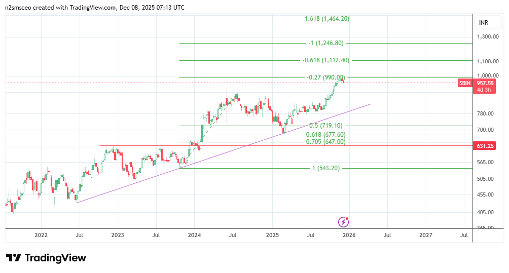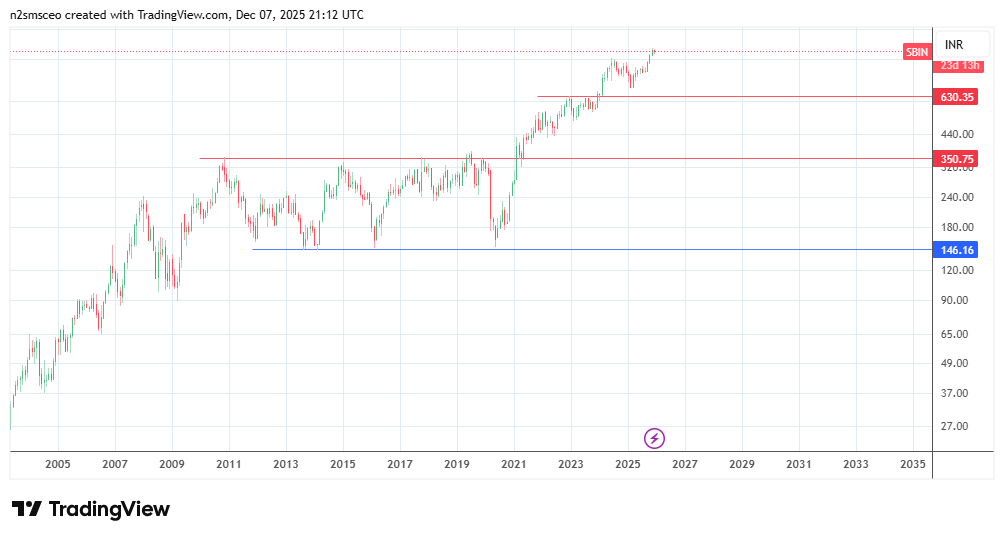A look at the SBI share price history on the monthly chart indicates that the stock has shown consistent performance in the last two decades. After breaking out of the multi-year consolidation phase, the stock has resumed the uptrend, closing for trading on Friday December 5, 2025 at INR 971.50.