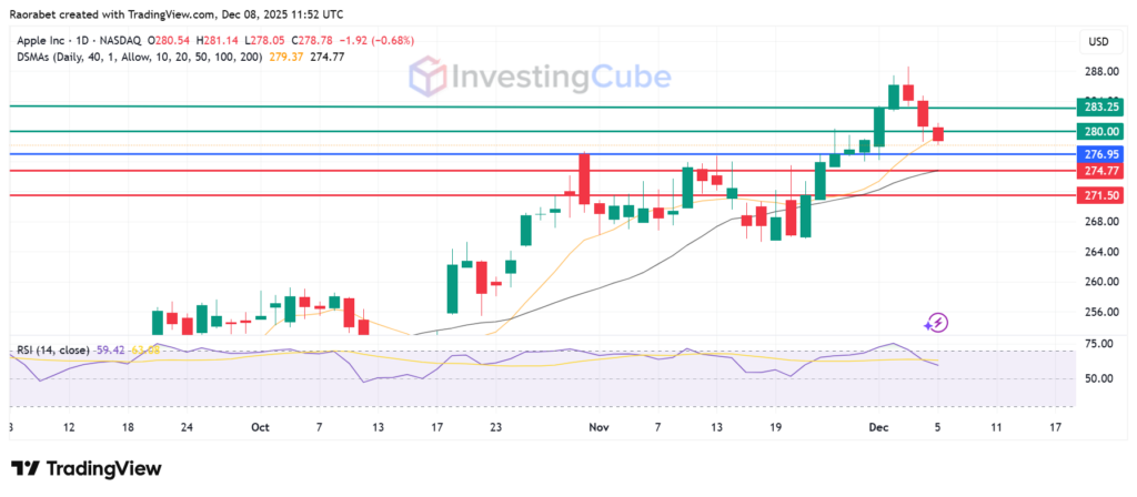 Apple stock chart reveals a stock maintaining a positive long-term and short-term trend. The immediate key support zone to watch is between the 20-day SMA at $274.77 and $271, a critical area formed by key moving averages. The pivot is at $276.95 while upside resistance is between $280 and $283.