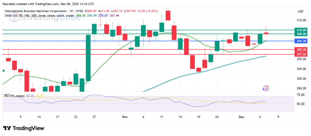 IBM stock chart has a stable momentum, with the RSI at 57 signaling a likelihood of continued gains. It’s holding above the $304.38 pivot, which corresponds to the 10-day SMA. The immediate barrier is likely to be at $308, but a stronger upside momentum could push the action higher to test $310.
