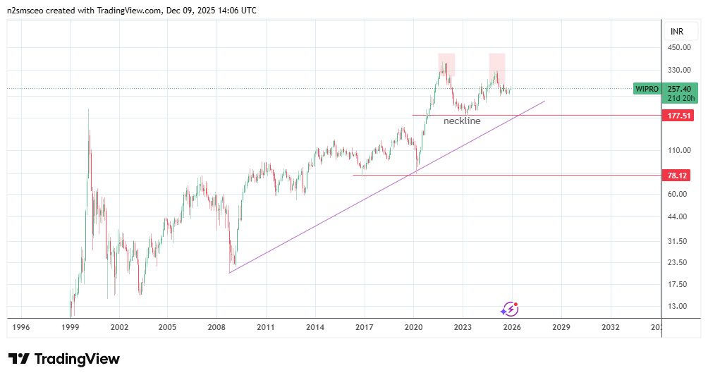The Wipro share price history can be seen on this chart below. The Wipro share price history that dates back to the 2020 pandemic year indicates that the stock is in the middle of a recovery of the uptrend. A pullback from the October 2021/January 2022 double top caught a bounce at 185.92, hit a lower high at 324.75 (Feb 2025 high) and is now in consolidation between the 220.61 support and 271.90 resistance.