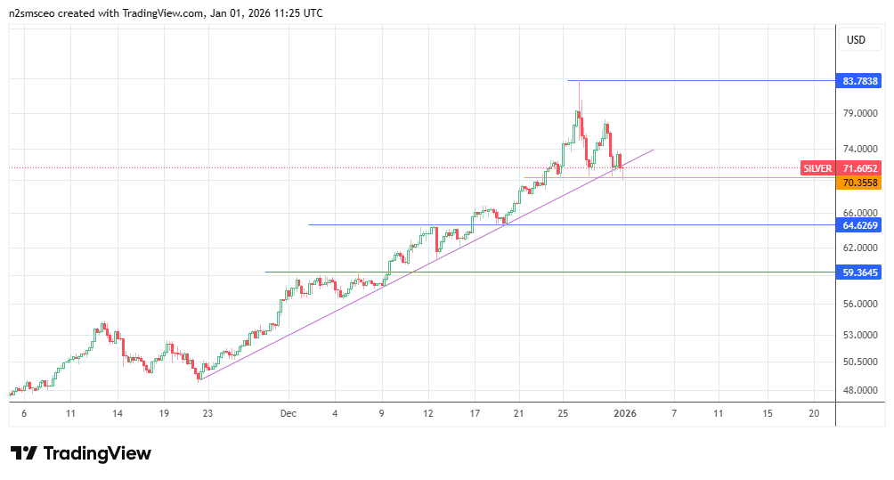 Silver spot prices closed 2025 at $71.60 per troy ounce. Silver prices increased by 147.88% in 2025.